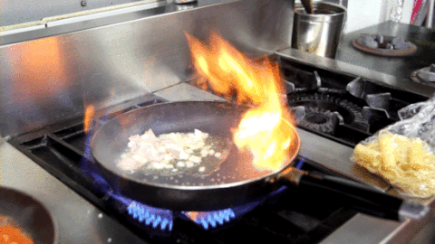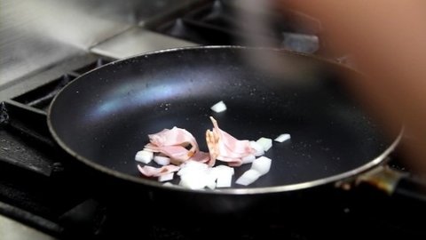 1. 팬에 베이컨, 다진마늘, 양파, 버터를 넣어주고 볶아줍니다