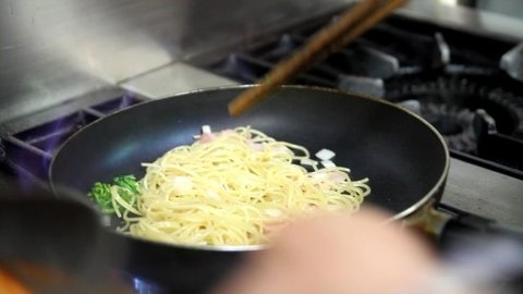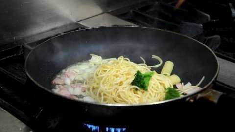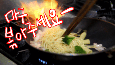 2. 살짝 볶아낸 다음 스파게티면과 브로콜리를 넣고 마구 볶아줍니다