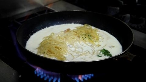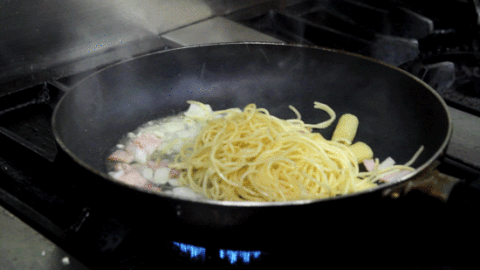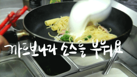 3. 면이 서로 달라붙을 정도로 풀어지면 까르보나라 소스를 부워준 후