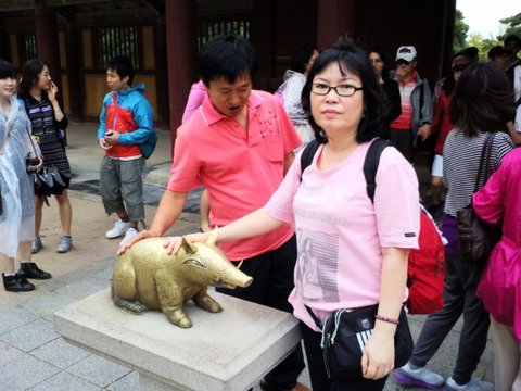 2007년 극락전 처마 밑에서 발견된 복돼지상을 쓰다듬는 중국인 관광객 1