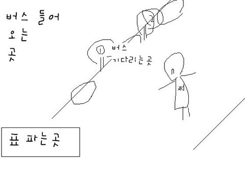 대략적으로 이래요, 아 어떻게 설명을 해드려야할지. 아무튼 직행 타는거 포기하고 그냥 평소타는 좌석버스 타러 갔죠. (이동경로 : 버스터미널-버스정류장) 터미널에서 그리 멀지도 않고 (약 2~3분) 가깝기도 하고 하니까 그 정류장으로 가는 중이었는데 웬 아저씨가 서있드라구요, 버스터미널 나가는 출구쪽에서. 솔직히 말해서 아저씨라고 치기엔 너무 젊어보였죠. 그냥 20대?( 알바하면서 왠만한 손님분들 나이는 다 알것 같드라구요.) 어쨋든 그냥 서잇구나, 하고 지나치려는데 갑자기 이 아저씨가 ㅡㅡ; 막 말을 거는거에요