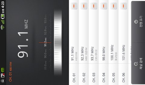 아이리버 탭기능중에 정말 특이하 점중 하나인데 라디오가 된다는 것이다. 보통 스마트폰에서 어플을 이용해 3G나 WIFI로 라디오가 되는것은 익숙하지만 정말 라디오수신기가 내장되어있는 경우는 드믈다. 채널자동 검색도 괭장히 빠르고 지역설정도 간단하다.