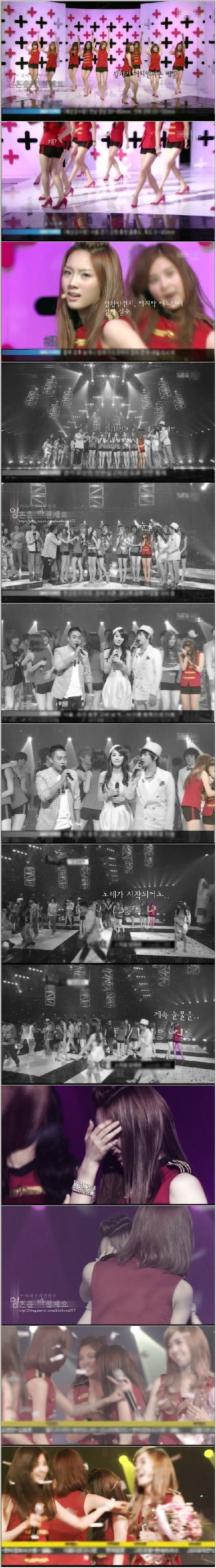태연 어, 너무 감동이구요, 지금 느낌을 정말 말로 표현할 수 없을 정도로 감동적인데, 저희가 설명하지 못했던 부분까지 다 알고 계신 것 같고, 서로 굳이 그렇게 말을 말로써 저희가 하지 않아도, 느낌만으로도 알고(울먹), 그러는 사이가 된 것 같구요, 그리고 솔직히 방송하면서, 굉장히 힘든 일도 많고 어려운 일도 많은데, 항상 그 때마다 정말 여러분들이 있었고(점점 더 울먹), 많은 오해도 있었지만, (말을 못 잇는 태연.. 여기서 돌아서서 눈물을 닦으며 울었습니다.) 그것까지 다 사랑해주신 분들이 여러분들인 것 같구요. (다시 울먹.) 너무나 감동적이어서 지금, 전부 다(말을 못하고 다른 맴버에게 마이크를 넘겼습니다)..