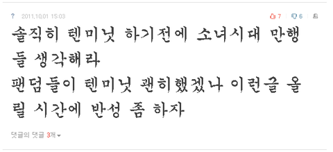 댓글 보니까 진짜; 아니, 제가 소녀시대 잘못 없다고 했어요? 소녀시대가 충분히 잘못했고 반성도 했고이에 대한 대가는 많이 받았으니까. 제발 이런 지난일로 까지 말아달라는 건데...