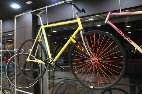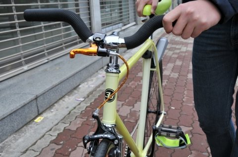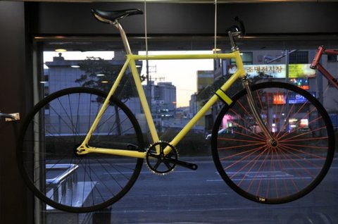 프레임에 바이크필름페스티벌 스티커(레드) / 후미등은 형광연두색 /앞바퀴 주황형광 휠도색