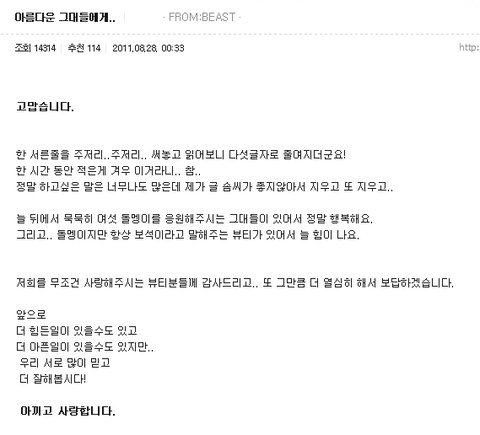 팬이 잘못하면 뷰티가 잘못한거라고 콕 찝어주기도하구요.