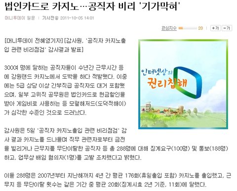 한켠에서 눈에 들어오는게 공직자 300명 카지노 출입. 법인카드로........국민의 세금으로..........쩝.