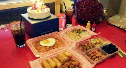 전전날에 턱 빠지도록 미리 불어놓은 풍선과 도시락, 장미를 들고 카페에 가서