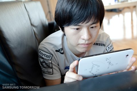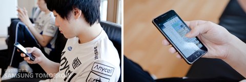 인터뷰가 끝나고 쉬는 시간 선수들은 무엇을 하고 있을까요? 허영무 선수는 손때 묻은 갤럭시S2로 웹서핑을 하고 있네요.
