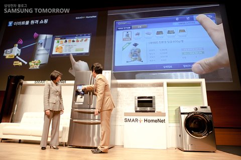 삼성전자가 유통업계 1위인 이마트와 손잡고 이커머스(e-Commerce)가 가능한 '스마트 냉장고' 출시와 함께 스마트 가전 전략 '스마트 홈넷(SMART HomeNet)'을 발표했습니다.
