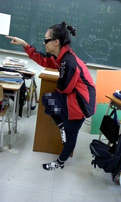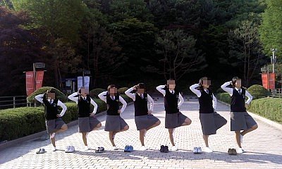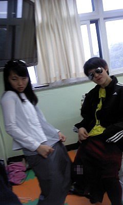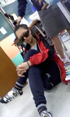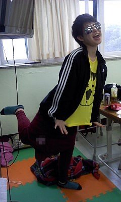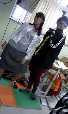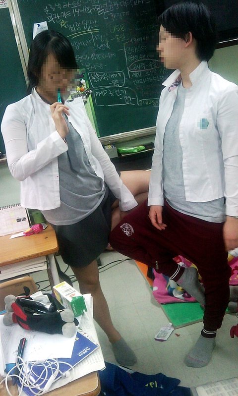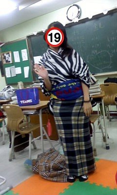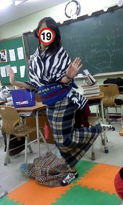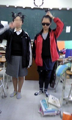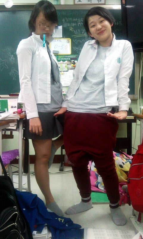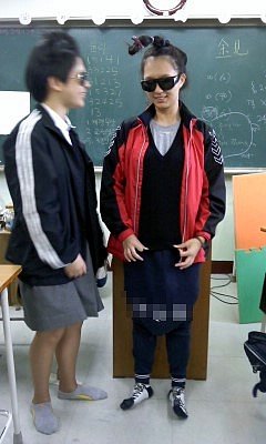 바지는 체육복을 거꾸로 입고치마는 한껏말아올려