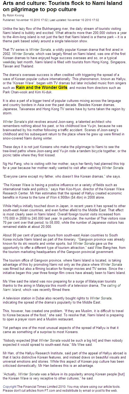 2010년 11윌 영국파이낸셜 타임즈에서 대표한류가수로 원더걸스와 비를 언급.
