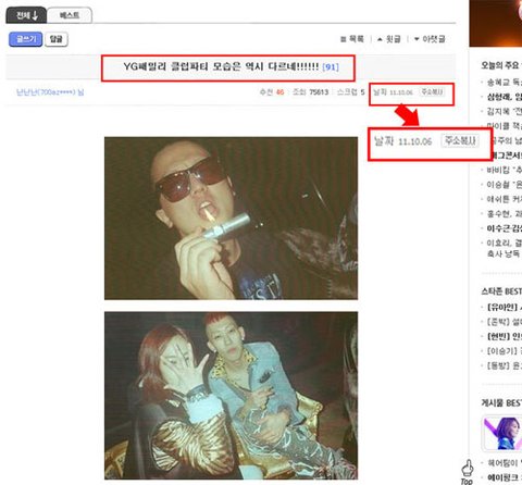 이 클럽파티 사진이 문제의 사진이다.이 사진의 원 글(YG패밀리 클럽파티 모습은 역시 다르네!!! - 링크주소) 게재는 바로 밑 캡처 사진이 있는 데서 시작된다.