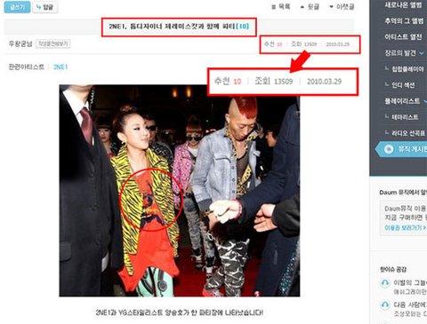 바로 1년 반이나 지난 일이었다.2NE1이 톱디자이너인 제레미스캇에 초대된 기사였고, 그 기사에는 파티 때 입은 의상 그 모습 그대로 사진으로 남아 있었다.이 사진이 게재된 것이 2010년 3월 29일자였고, 문제가 된 사진은 바로 2010년 3월 28일 날짜가 새겨진 파티 사진이었다.