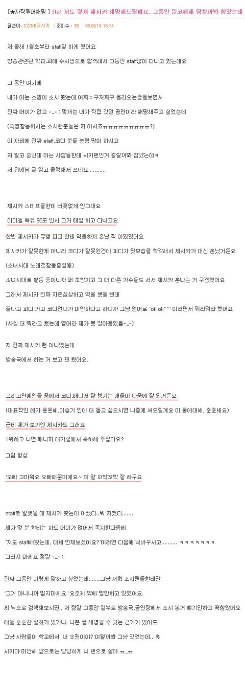 제시카는 사람 아닙니까? 그렇게 먼저 욕하고나오는데 제시카는 연습생이라고 데뷔해야되서 이미지관리해야된다고 아무말도 못하고 서있어야해야됨? 제시카가 X발 어쩌고저쩌고 하면서 욕했다고하는데 그것도 아니래요, 그냥 '아..진짜 미쳤나봐 왜이래' 이런식으로 말했어요. 저한테 말해주신 분이 옆에서 말하는거 다 들었구요. 그분이 저한테 말씀하시면서 제시카가 사생한테 먼저 시비걸고 그랬다는거 진짜 어이가 없다고 하셨어요. 제시카 맨날 사생 피해서 도망다니던 애라면서 자기한테 잘해주는 사람한텐 제시카도 잘해준다고했어요. 제시카도 김희철처럼 나랑 모르는사람/나하고 잘 아는사람 선이 뚜렷할뿐이래요.