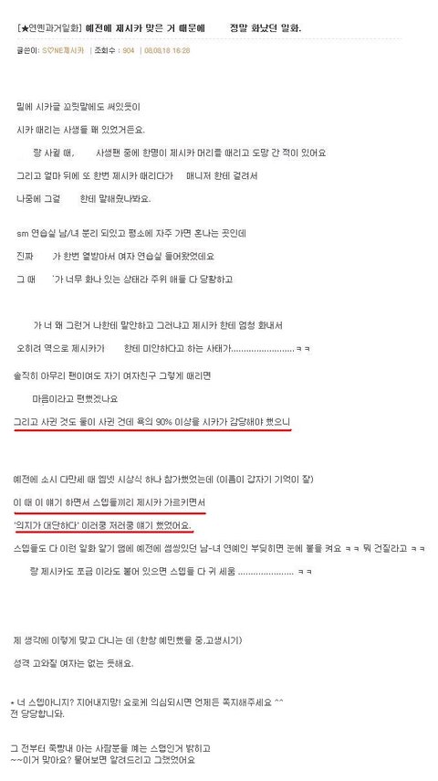 그리고 사생이 제시카한테 당한거 무섭다 이럴 자격이나 있습니까? 제시카가 사생한테 훨씬 심하게 당했다고하던데요. 제시카가 맥도날드 가길래 저한테 말해주신분이 '수연언니~ 따라가도 돼요?'이랬더니 제시카가 '네 오세요ㅎㅎ' 이래서 그분이 따라갔데요. 근데 맥도날드 안에 엘프로 추정되는 분들이 있었는데 그중에 어떤분이 우리 희철오빠한테 꼬리치지말라면서 제시카한테 주스인가 콜라인가 하여간 둘중 하나를 뿌렸다네요. 그래서 제시카 친구들이 제시카한테 콜라뿌린분한테 미쳤냐고 얜 사람 아니냐고 뭐라하고 제시카는 '죄송하다구요..'이러고서 나갔데요. 그래서 이분이 막 울먹거리면서 괜찮냐고 계속 그랬더니 괜찮다면서 달래줬데요.