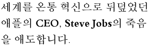 아마 스티브 잡스가 없었더라면, 우리는 비싼 통신비에 저렴한 성능의 핸드폰을 사용하고 있었을 것입니다. 아직 IT계에 혁명이 더 필요한데 그 작업은 스티브 잡스만이 할 수 있습니다. 벌써 이렇게 가게되어 정말 슬픕니다.