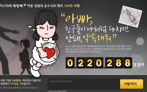 초록우산 어린이재단은 나영이 아버님과 함께 '아동 대상 성폭력 범죄 공소시효 폐지'를 위한 서명 캠페인을 진행 중입니다.