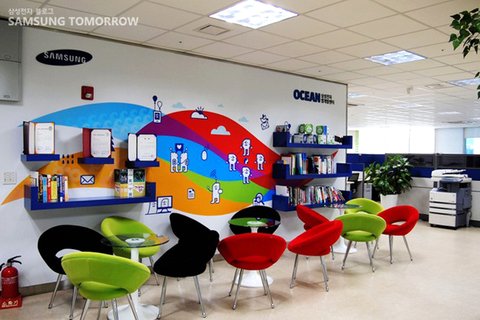 탁 트인 공간 바로 옆에는 교육장이 있는데요, 이곳에서는 주로 ‘bada'에 대한 강의가 진행된다고 합니다. 실제로 앱 개발 분야에 종사하는 개발자들에게도 역시 ‘bada'는 아직 덜 익숙한, 배워야 할 것이 많은 플랫폼이기 때문에 배움의 기회를 제공한다고 하네요. 전체 81석 규모의 개발공간은 개발 과제 수행 상황에 따라 사무실처럼 이용할 수 있는 장기 좌석과 어플리케이션 테스트를 위해 웨이브폰을 배치한 일반 좌석으로 구분돼 용도에 따라 이용할 수 있답니다.