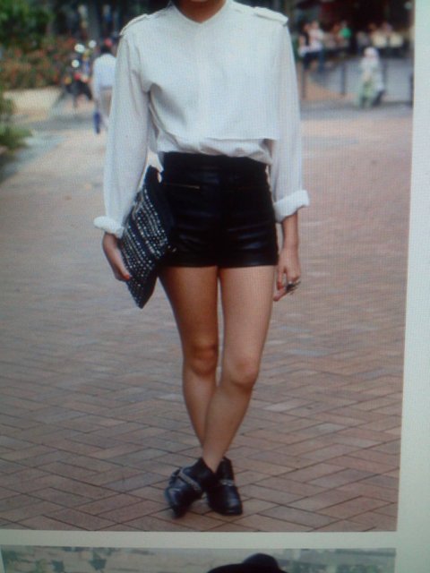 ( 배꼽까지 올라오는 짧은 핫팬츠에 블라우스로 배바지를 연출한...)