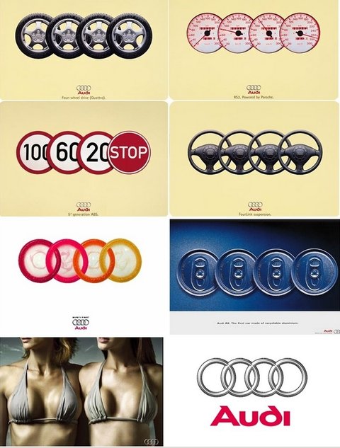 이렇듯 아우디의 인쇄물 광고는 되게 재미난 의미들을 포함하고 있는데, 재밌는 점은 대부분 아우디의 로고를 형상화하여 하는 광고들이 대부분이랍니다.