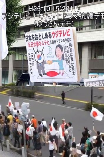 이날 550여명의 시위대는 "김태희 물러가라" "후지TV는 반일 여배우 김태희 당장 퇴출 시켜라"