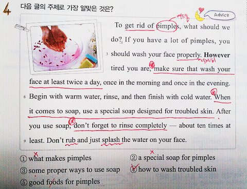 여드름을 줄이는 방법을 소개해보기 위해 다음의 문제집 지문을