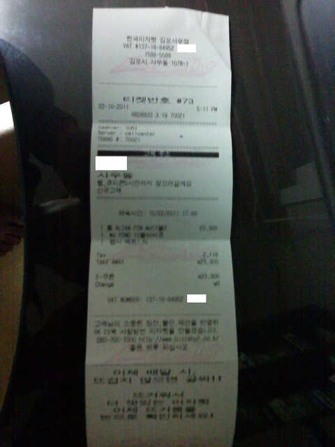 위쪽에 보시면 흐릿하게 "PM 5:11" 이라고 찍힌게 있습니다. 제가 도착하여 영수증을 발행한 시간입니다.
