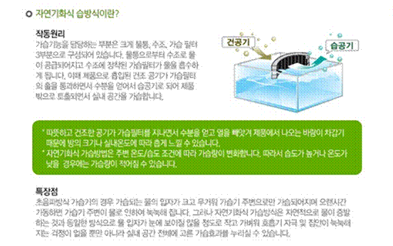 자연기화식은 말 그대로 공기 흐름을 이용해 물을 자연 증발시켜 실내 습도를 조절하는 방식인데, 앞서 다른 가습방식에 비해
