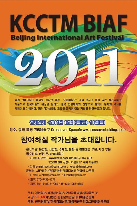 베이징국제아트페스티벌 행사(KCCTM BIAF)는 한중 수교20주년을 앞두고 한중 미술 상호교류와 협력을 통해 세계 미술계에 한국 화가 작품을 알린다는 행사로 주목됩니다. 주관사인 사단법인 한중문화관광미디어총연합회 사이트(http://www.kcctm.com)에 가면 참가신청서와 행사 소식을 볼 수 있습니다.