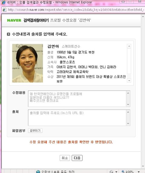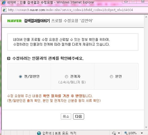 해당 인물의 프로필을 보면 오른쪽 위에 프로필수정요청이 있음 그걸 누름