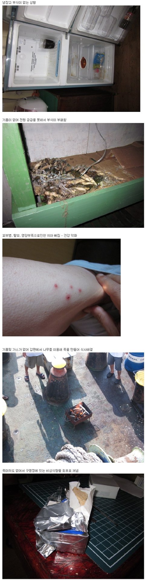 배가 외항에 떠 있어서 육지로 전혀 나올 수가 없어 현재 식량도 없고 식수도 부족한 상황에서 전기까지 사용하지 못해 인간적인 생활을 할 수 없는 상황입니다.
