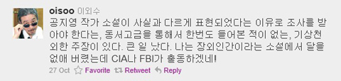 이외수씨는 27일 자신의 트위터에서 “공지영 작가 소설이 사실과 다르게 표현되었다는 이유로 조사를 받아야 한다는, 동서고금을 통해서 한 번도 들어본 적이 없는, 기상천외한 주장이 있다”며 “큰일 났다. 나는 장외인간이라는 소설에서 달을 없애 버렸는데 CIA나 FBI가 출동하겠네!”라고 적었다.