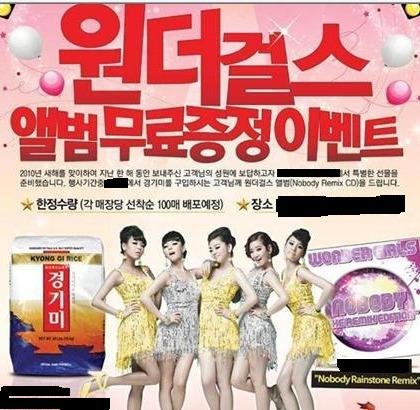 한국식품점에서 쌀 한가마니를 사면 원더걸스 앨범을 선물로 준다는 광고를 신문에서