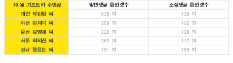 2011년 10월 3일부터 10월 22일까지 총 20일간 진행된 10월의 기프트카 응원댓글에는 5명의 기프트카 주인공에게 총 2,150개의 댓글이 달려 성공적으로 종료되었다네요. 10월에 이어 따뜻한 마음을 담아 11월에도 찾아올 새로운 기프트카 주인공들에게 희망을 줄 수 있는 응원댓글이 되어줬으면 해요!