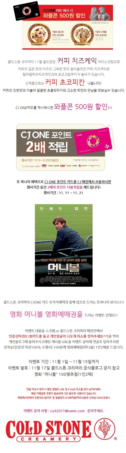 콜드스톤 크리머리에서 cj one 카드를 제시하면 두가지 혜택을 준다고 하네요~