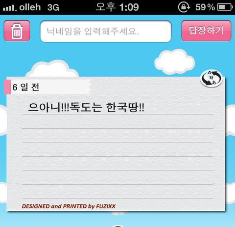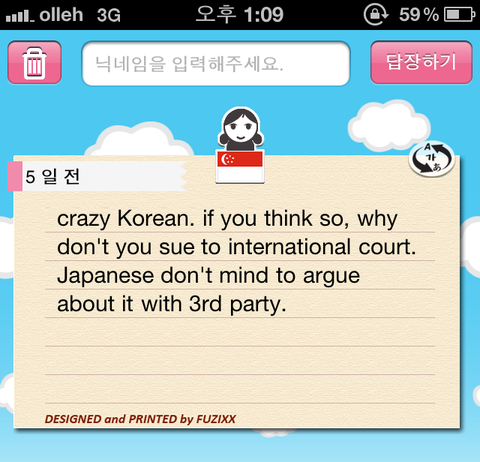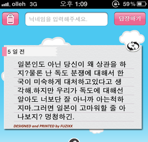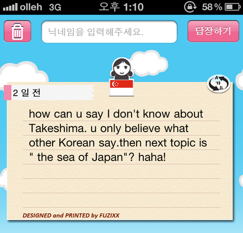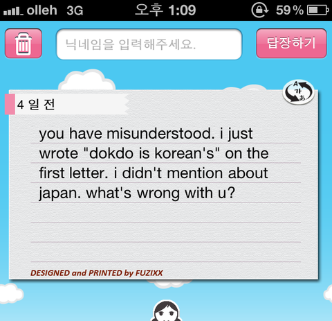 제가 넌 독도에 관해서 잘 모르니까 나대지말라고 보냈더니 온 답장