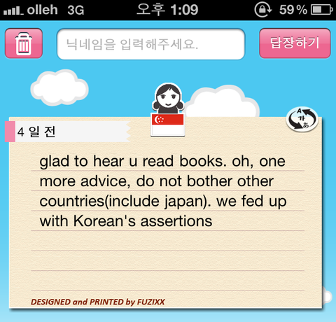 '네가 책을 읽는다니 기뻐. 아, 그리고 충고 하나만 더 해둘게, 일본을 포함한 다른 나라 좀 귀찮게 하지마. 우리는 한국의 주장에 진절머리가 나니까'