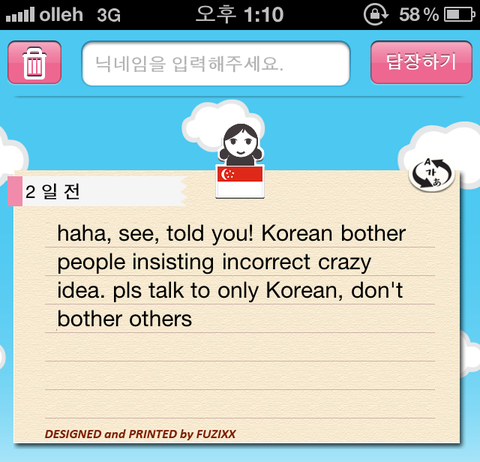 " 제발 그 얘기는 한국인 끼리만 해라. 남들 귀찮게 하지말고"