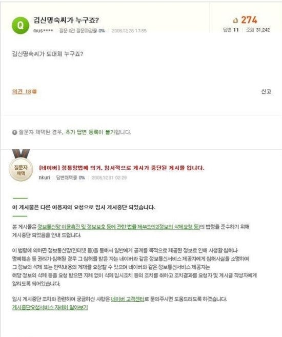 네이버에 김신명숙에 대한 질문에 답변이 모두 네이버측에 의해 강제중단당했다.