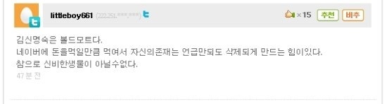 블로그에 개재된 글마저 김신명숙에 대해 조금이라도 비방했다면 게시글중단을 했던 네이버의 볼트모트라고 불렸다. 내가 저번 셧다운제에 대해 말할 때 "나도 총대신 책을 잡고싶었다" 라고 말한 주인공이 김신명숙이 참가했던 토론에서 방청객이 한 말이였다. 그러나 이건 김신명숙의 깔보는 듯한 웃음소리로 묻혀버렸다. 굴욕이 아닐 수 없다. 나는 이 글을 스크린 샷으로 찍어놓으며, 전혀 부적절한 단어의 언급도 없으며 사실그대로를 전하므로 이 글을 중단시킨다면 이 글이 중단되었다는 어처구니 없는 말과 함께 대포털사이트에 전부 올려버릴 것이다.