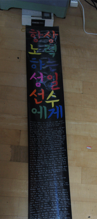 김성일선수.....맞습니다, 지금은 여행중이니까 집에가서 완성작사진올릴게요 그건 모자이크 별로안하고올릴게요ㅜ받는사람도 기대는해야하니까조금의모자이크^^!톡되게해주셔서 감사하고요,성일선수는 싸이는안해요ㅜㅜ음,또..어떻게만드는지 질문하신분도계셨는데 제가 일요일에 집에가니까 그때 다~~~~올려드릴게요 급하시면 일단 전지 사서 세로로 반접고 또반접어서 자르시고 일단꾸미세요,그리고 길게 스카치테이프로연결하시고 시트지 붙이시면끗!!!!!!!!톡되게해주신모든분들감사하구요 모든 스포츠종목 흥해라,지금 쇼트트랙월드컵나가서 다친 이정수 선수 빠른 쾌유를 빕니다.