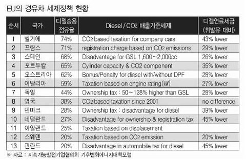 디젤(경유)은 가솔린보다 연비 20~30% 좋고 co2 배출량도 적고