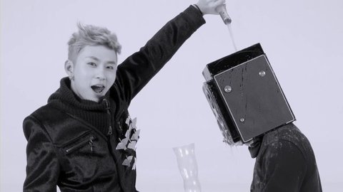 자신을 묶고 있던 스피커에 술(?)을 부으며 즐거워하는 모습.