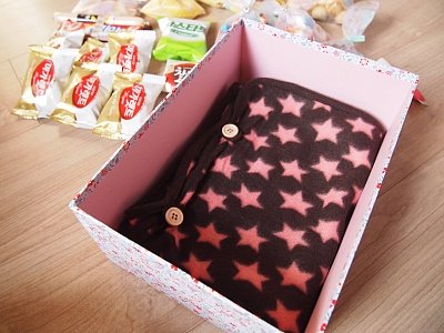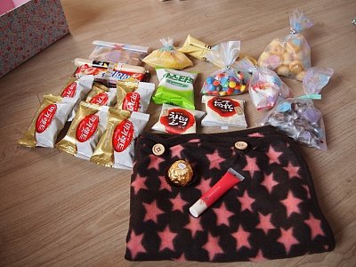 포장한 요깃거리와 립글로즈 무릎담요 등
