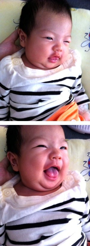 여러가지 동작으로 힘을줘도, 아기는 계속 머리에 힘을주어 위를 쳐자보고 있었음..
