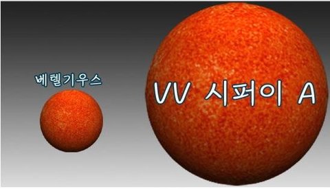 태양반지름의 약800배인 베텔기우스와 시퍼이의 크기비교입니다