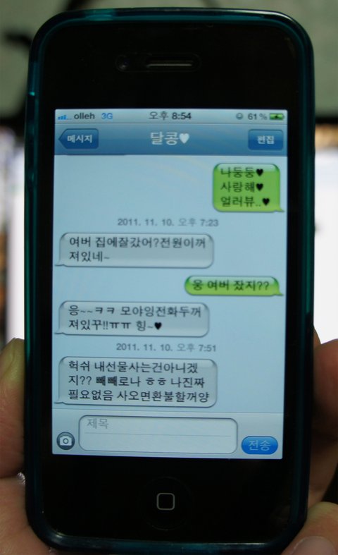 애인: 응~~ㅋㅋ 모야잉전화두꺼져있꾸!!ㅠㅠ 힝~♥