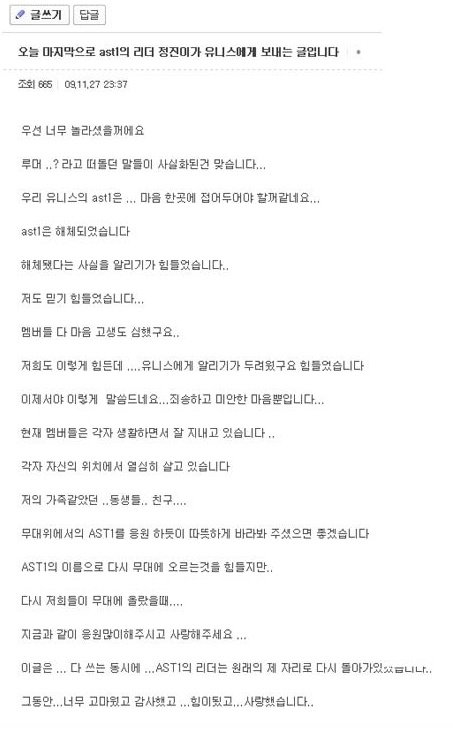 해체관련기사에 나온 에이스타일 리더 박정진의 글