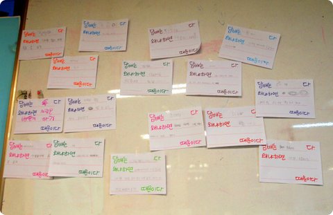 교육이 끝난 후 아이들이 적어준 <담배는 000이다. 왜냐하면 000이기 때문이다>